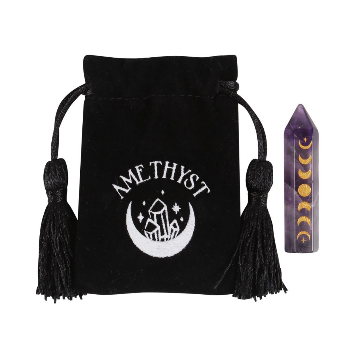 ✦ This beautiful amethyst crystal point is perfect in size for travel altars, desk decor or taking on the go for extra protection. Features a gold-tone moon phase engraving and comes with a matching drawstring bag for storage and safe-keeping.