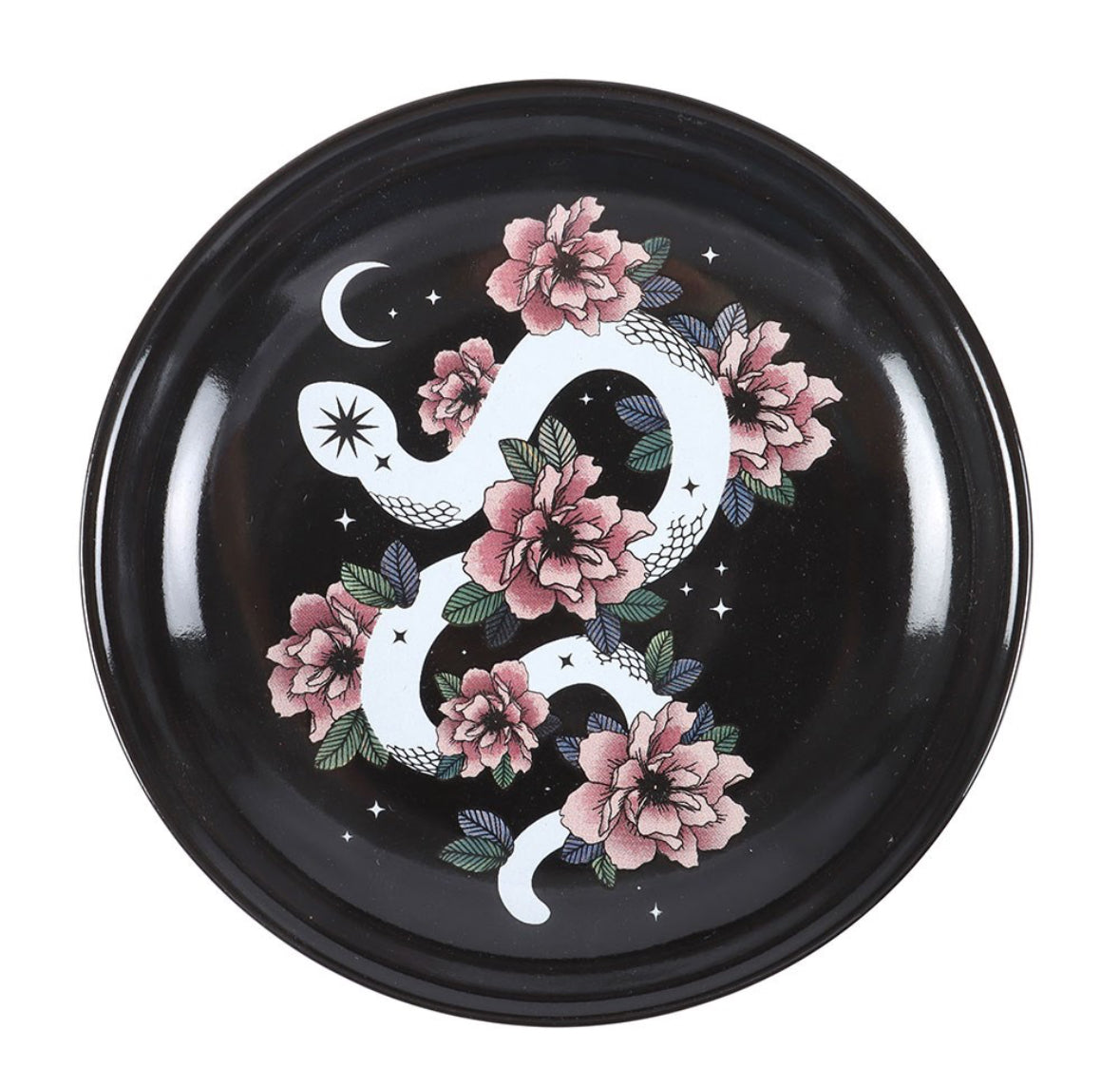 ✦ This trinket dish features a curled, white snake and soft pink flower design set against a black, starry sky. Perfect for holding jewellery, keys, and other small treasures, this design celebrates the harmony between nature's light and dark elements, making it a beautiful accent for homes that appreciate both strength and softness.