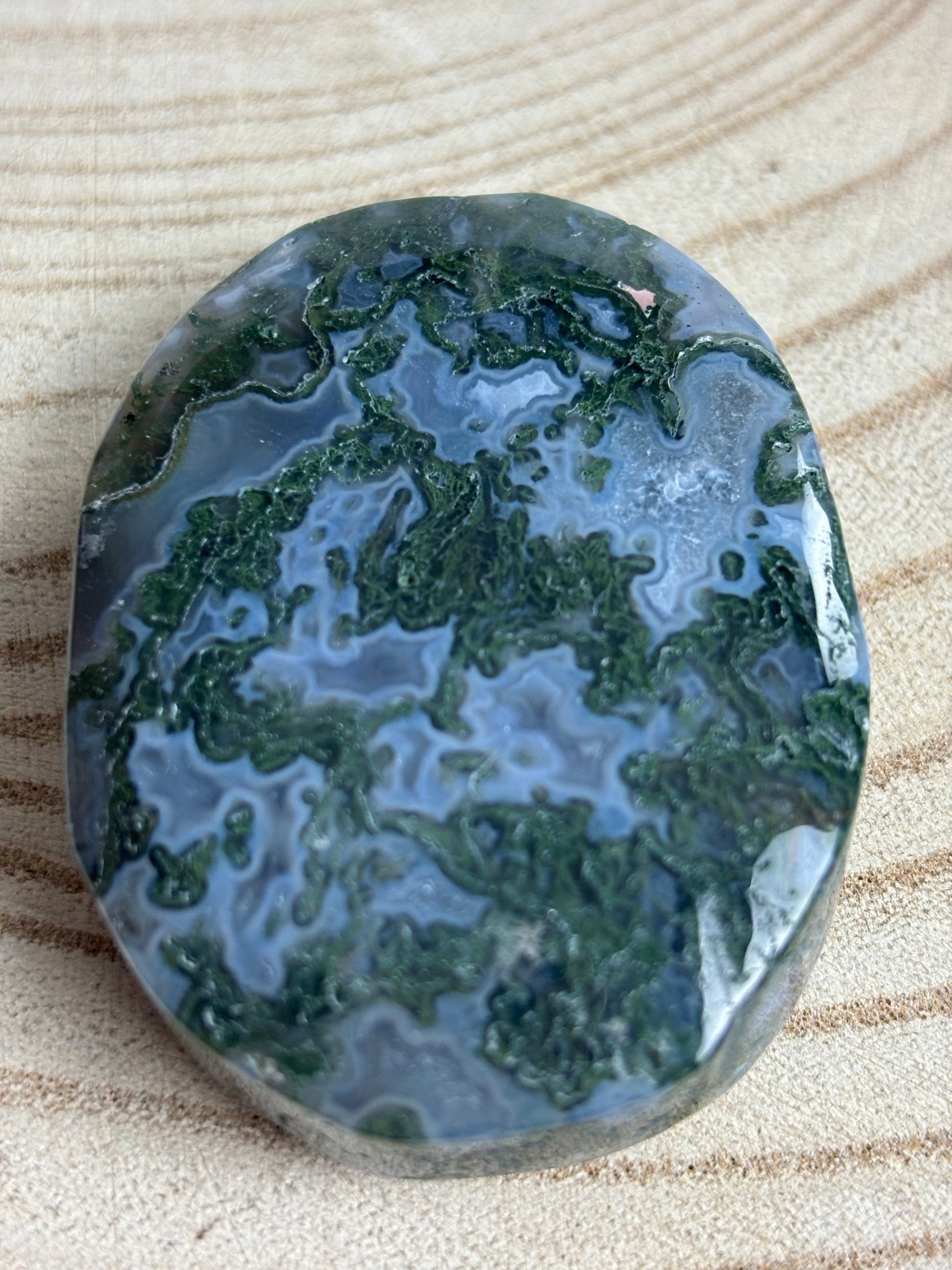✦ Moss agate is a soothing green and white crystal known for its moss-like inclusions that resemble nature scenes. In crystal healing, it’s believed to promote growth, renewal, and emotional balance, making it a powerful stone for new beginnings. Often associated with nature and abundance, moss agate is also thought to reduce stress and enhance spiritual and physical well-being. Its earthy appearance and calming energy make it a cherished stone for both healing and connection to the natural world.