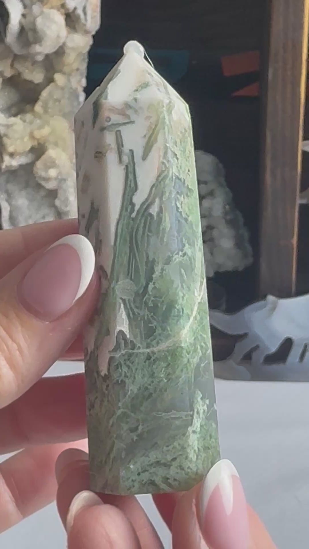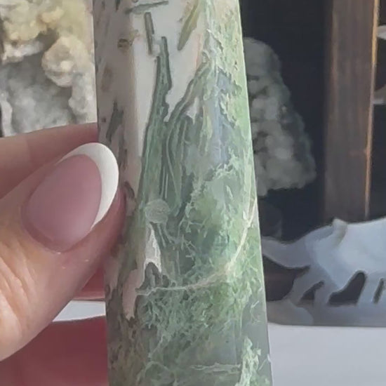 ✦ Moss Agate is deeply connected to nature and grounding energy. It promotes growth, abundance, and emotional balance, making it perfect for manifesting intentions and soothing stress. With its earthy green patterns, Moss Agate brings a calming, nurturing energy to any space or practice.