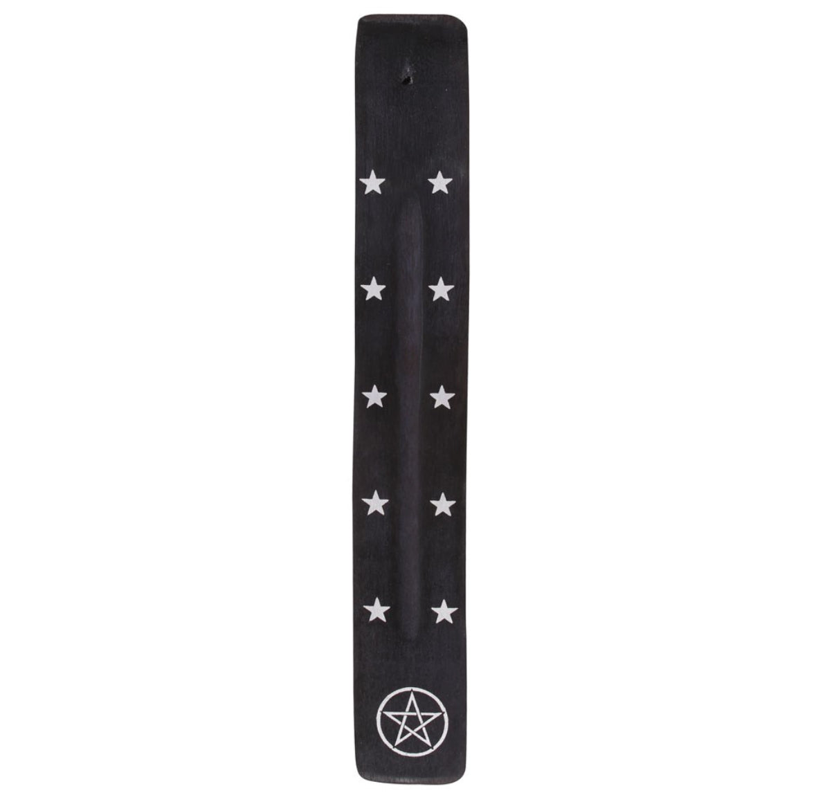 ✦ This gothic take on a traditional incense stick ash catcher is made from mango wood and features a printed pentagram symbol accented by silver stars